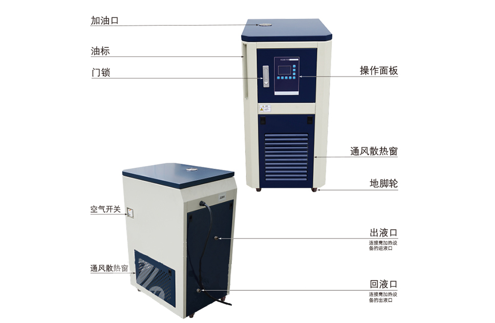 本產品一般配合雙層玻璃反應釜、不銹鋼反應釜、搪瓷反應釜等具備夾層的反應設備使用,從油浴鍋的出口閥門管路連接到反應釜體下方的進液口,循環液再從釜體上方的出液口通過管路回到油浴鍋的進口,形成一個完整的循環空間。