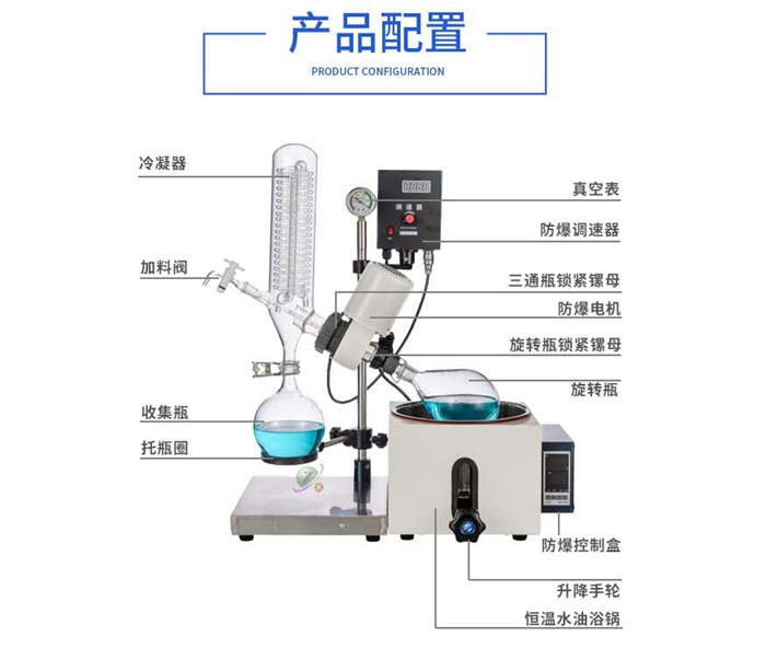 旋轉蒸發器還可能包括其他輔助部件,如升降手柄、控制面板、加料閥等,以確保設備的穩定運行和操作的便捷性。這些部件共同協作,使旋轉蒸發器成為一種高效、可靠的蒸發設備,廣泛應用于化學、化工、生物醫藥等領域。